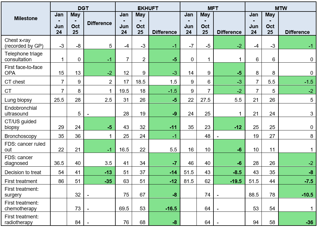 - Achievement of breast cancer 28-day Faster Diagnostic Standard, 31-day treatment target and 62-day referral to treatment CWTs, and the % of breaches are reduced