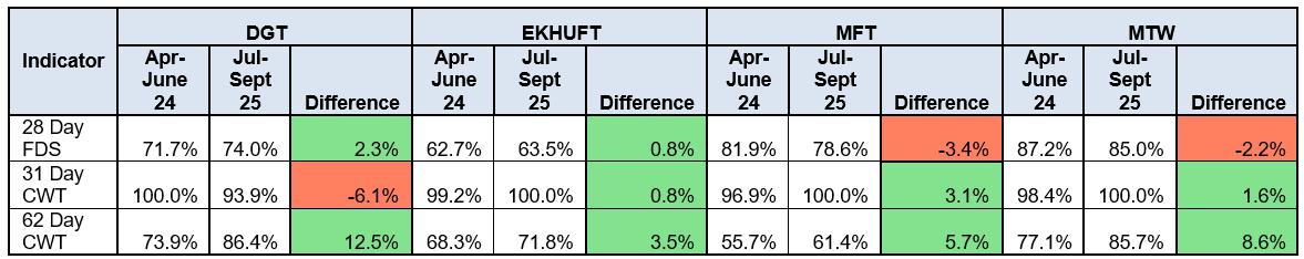 - Achievement of the breast cancer 28-day FDS, 31-day treatment target and 62-day referral to treatment CWTs