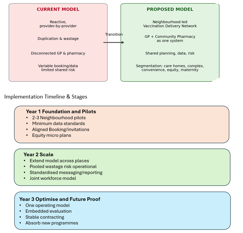 - Deployment of enabling activities and improved Governance: (i) formal GP–pharmacy collaboration at PCN/Place: shared cohort allocation, capacity planning, pooled wastage risk; (ii) standardised booking/invitations and shared reporting; (iii) system Vaccination Delivery Board with Place/PCN operational groups, and LMC/LPC input